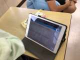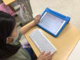 4年生が巴学習で竹炭を学習しています。 タブレットにキーボードをつないでいます。...