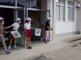 毎朝、生活委員さんが児童玄関であいさつ運動をしています。 いわくらっこの旗をもっ...