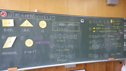 算数では、「対称な図形」について学習を進めました。5つの図形を2つに分類する中で、半分に折るとぴったり重なる図形があることを発見しました。