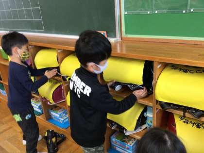 朝の時間に進んで整頓をしています。ロッカーから物がはみ出ないように、工夫しています。
