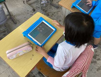 「Viscuit」というアプリを使い、プログラミングの学習をしました。「メガネ」の中に自分の描いた絵を入れることを体験しました。絵が動き回るのを見て、とても驚いていました。