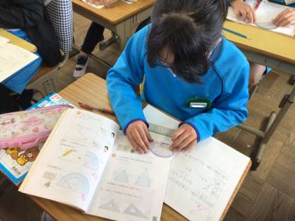 辺の短い角も分度器の目盛りに届くように工夫して取り組みました。