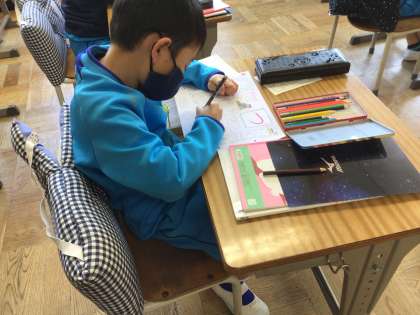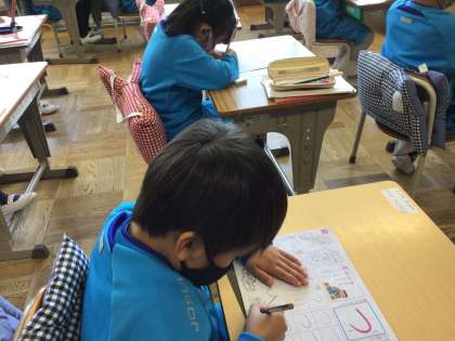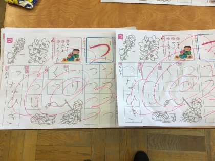 ひらがなを習い始めました。はみ出さないようになぞるのは、とっても大変。どの子も集中して練習しています。
