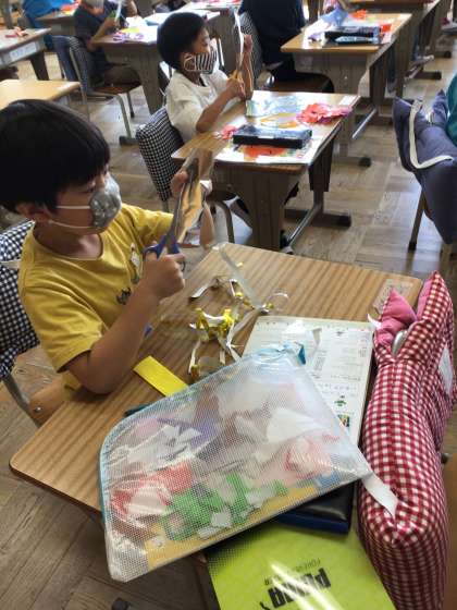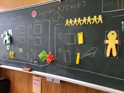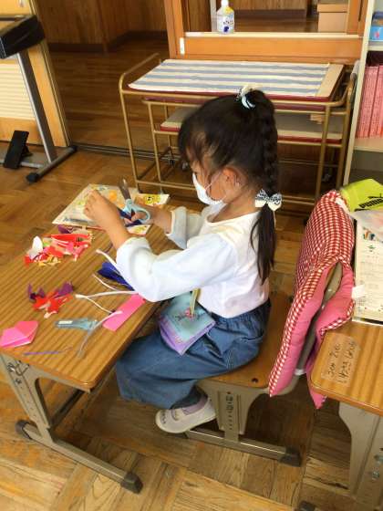 今日は、おりがみを折って切って楽しみました。折り紙の折り方や、はさみの使い方をみんなで練習して、とってもきれいな飾りができました。