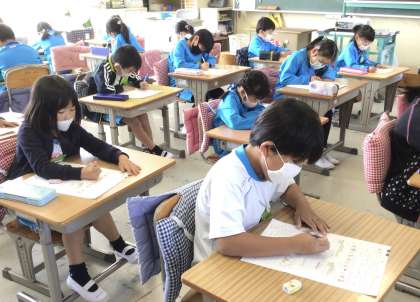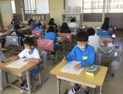 2年になって最初のテストは算数です。よく考えて、問題を解いています。