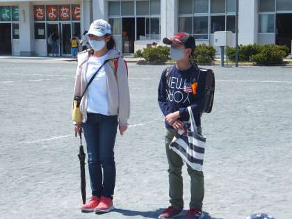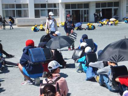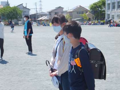 下校するとき、各学級委員が交代で、6年生のみんなの前で気づいたことを話します。帽子を脱いでから、さようならの挨拶をします。