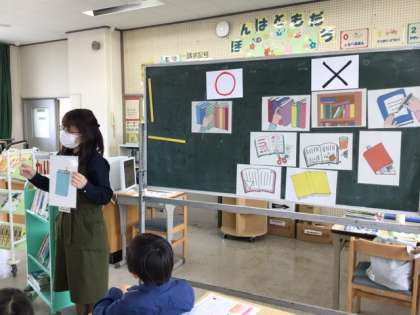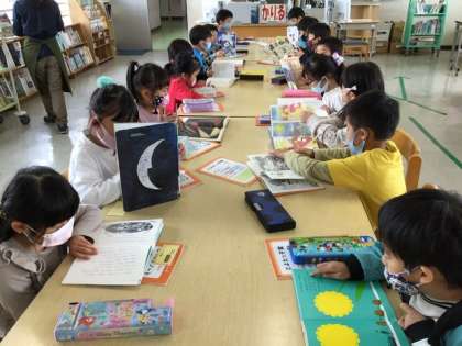 図書館司書のすずきさんから、本の借り方を教えてもらいました。「読書ノート」を使って正しい本の扱い方を知り、本を大切にしようという気持ちが芽生えました。さっそく1冊借りて、嬉しそうに本を読む子どもたちでした。
