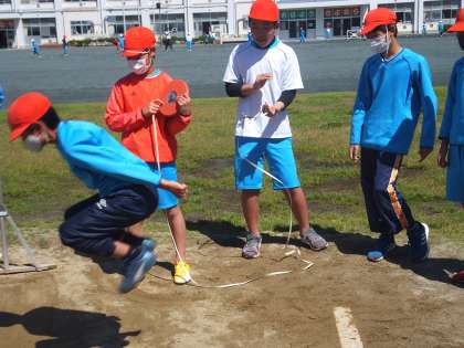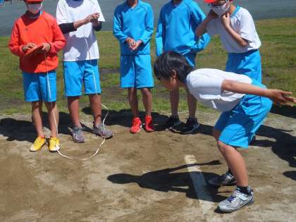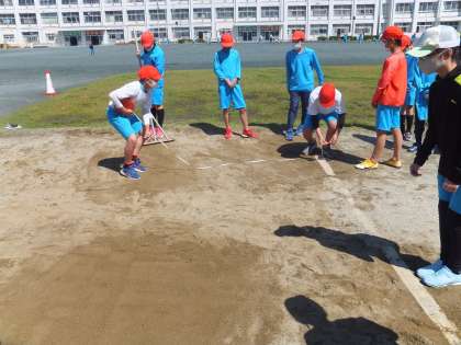 ゴールデンウィーク明けの本日の1時間目は、立ち幅跳びの練習を行いました。1人2回ずつ跳びました。最高記録は198cmでした。