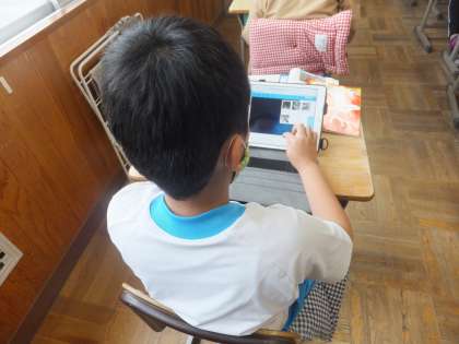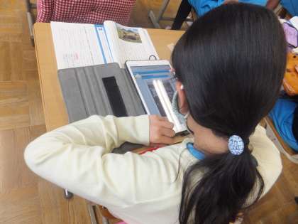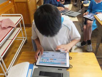 国語の授業では、イースター島に関わる言葉を、ICT機器を使って調べました。10分の間に、5つの言葉を調べた子どももいました。