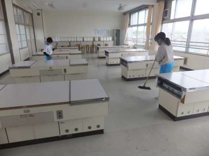清掃活動中です。教室と手洗い場、家庭科室の清掃の様子です。無言で、一定距離を保って行っています。