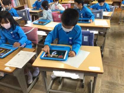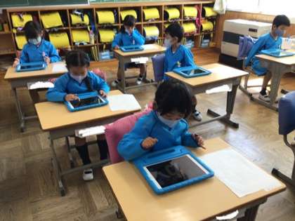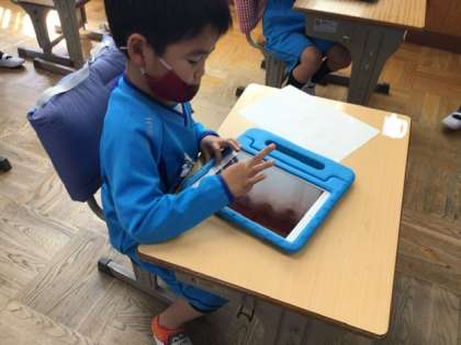 今日から、「iPad黄金の3日間」が始まりました。パスワードの設定を自分で行いました。早く終わった児童は、ひらがなのアプリを使って、さっそく学習をしています。