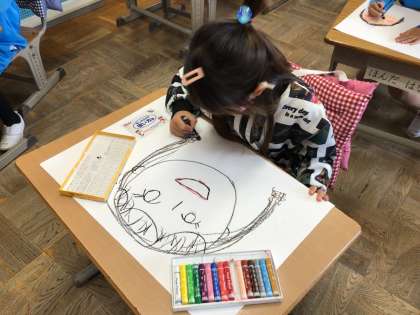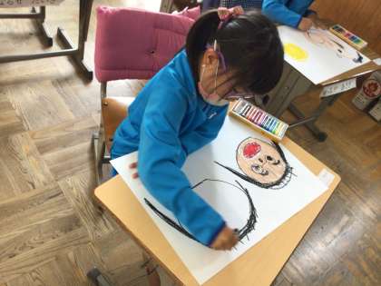 図画工作「みてみて あのね」の学習の様子です。見る人に気持ちが伝わるように、顔を大きく表情を工夫して描くことを意識しています。
