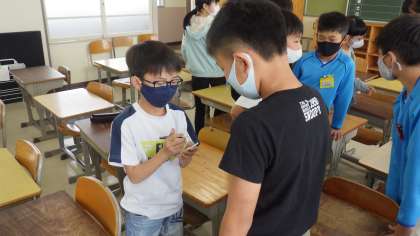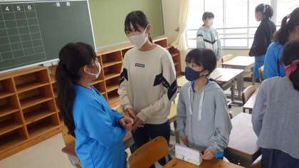 挨拶運動を広めるためにはどうしたらよいかという5年生の学級委員に対して、6年生の学級委員がアドバイスを行いました。