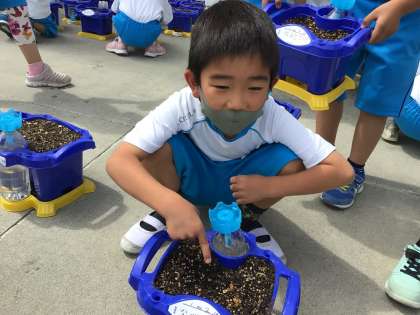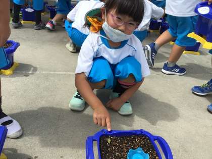 よく見ると、あさがおの芽が出ていました!さっそく、水やりをして土日に備えます。