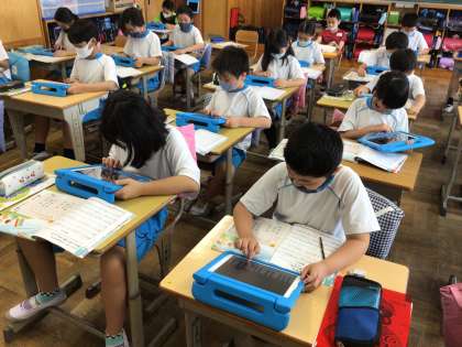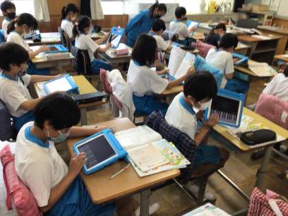 コロナ禍で楽器演奏に制限がありますが、iPadのガレージバンドというアプリで旋律作りをしました。様々な楽器の音を楽しみながら学習に取り組んでいました。