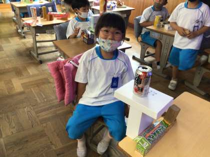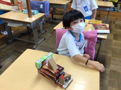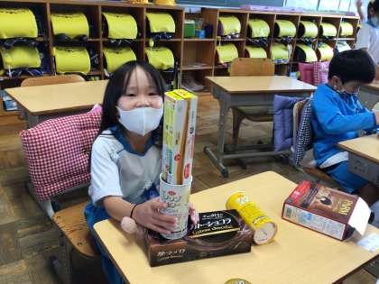 「いろいろなかたち」の学習の様子です。箱や缶を使って、いろいろな動物や乗り物を作りました。さて、これらの作品は一体何でしょうか?