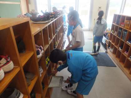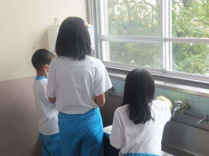 清掃活動では、1年生の教室や1年生が利用するトイレ、手洗い場などを1年生と一緒に掃除しています。