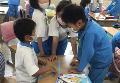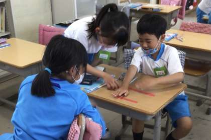 テープで10cmと思うところを切りました。友達同士で比べあい、誰のテープが10cmに近いか予想しました。10cmがどのくらいか、だんだん分かってきました。