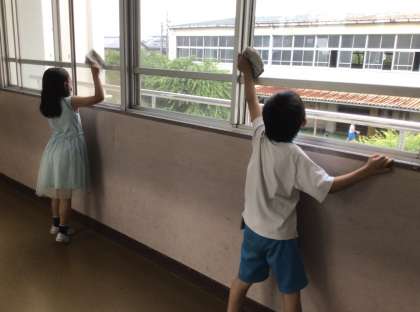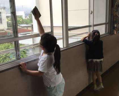 雨で外の掃除ができません。運動場担当の子達に、窓拭きをしてもらいました。力を入れて、しっかり磨きました。
