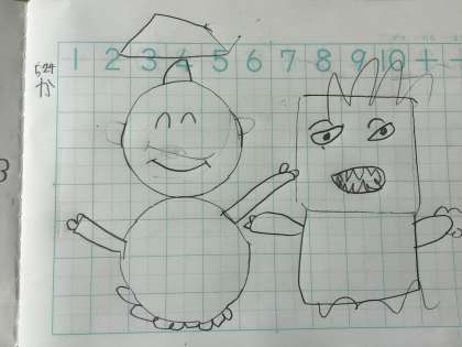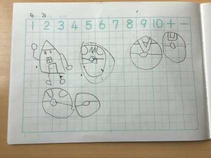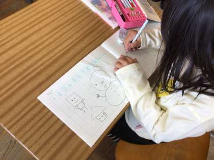 「いろいろなかたち」の学習で、形をいかして絵を描きました。かわいいロボットが人気でした。