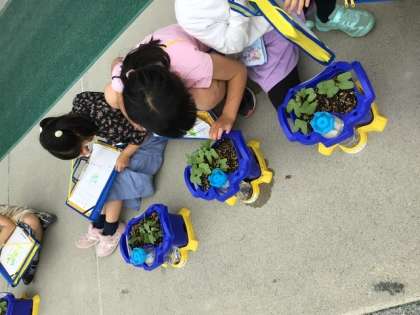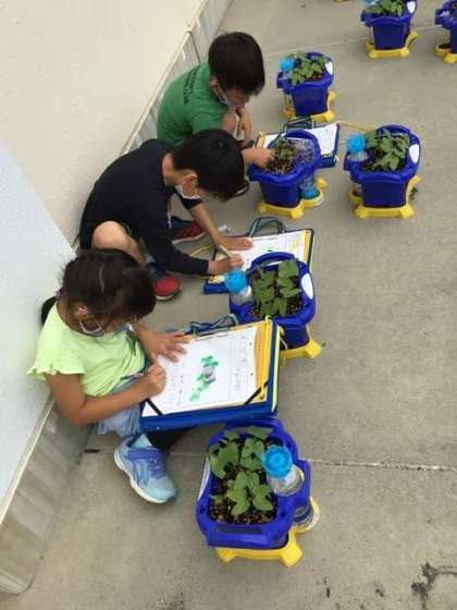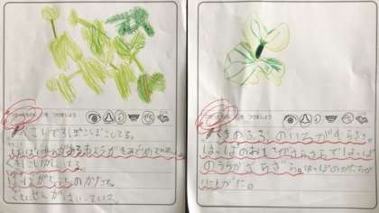 生活科では、あさがおの観察をしました。種から芽を出して、少し大きくなったあさがおに、みんなにこにこ笑顔でした。目で見て、触って、においをかいで、しっかりと観察できました。観察して気付いたことをワークシートへまとめました。