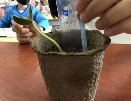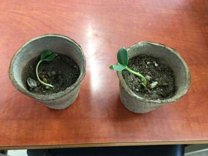 鉢に植えた種は、芽が出始めています。写真の植物はヒマワリです。
