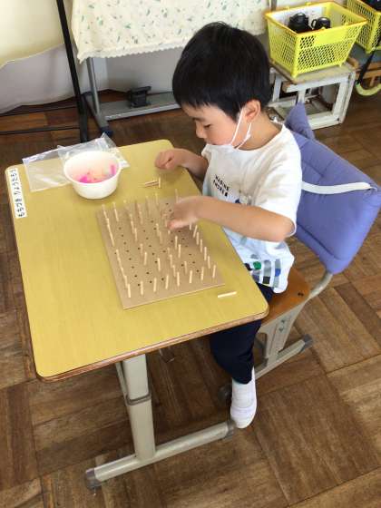 ピックさしを使って指先のトレーニングをしています。