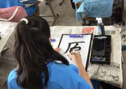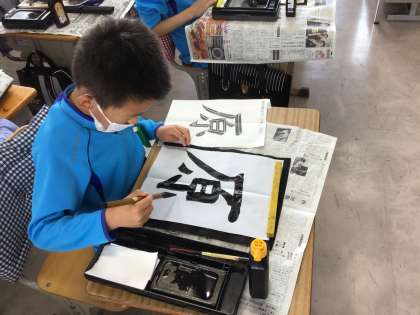 書写の時間に毛筆で「原」を書きました。文字の中心に気をつけて、丁寧に書いていました。