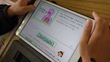 理科では、人間の呼吸を学習する中で、酸素が二酸化炭素に変わるのはどこか?という前時の疑問をもとに、調べ学習を行いました。