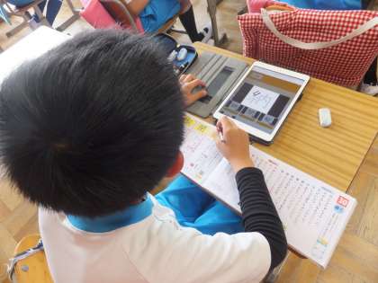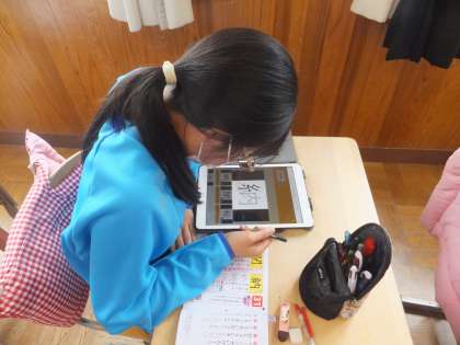 今日は、タブレットを使って、新出漢字を学習しました。ボタンを押すと書き順が映像で流れます。