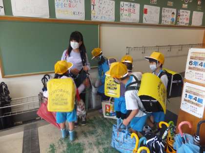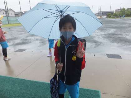 今日は、雨天でした。雨天時の登校の様子です。1年生に囲まれている6年生もいます。