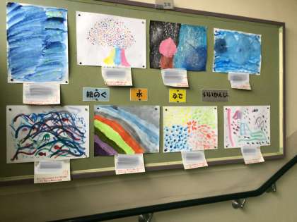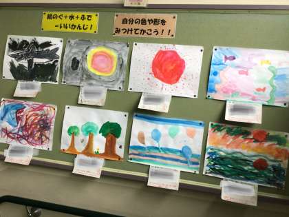 絵の具と水と筆を使って思いを表現しました。どの作品も個性があって面白いです。