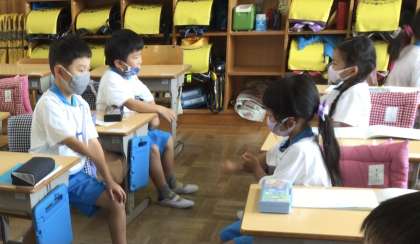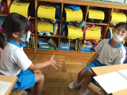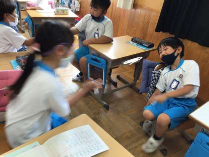 「たしざん」の学習の様子です。今日は、「算数じゃんけん」に挑戦!お互いに出した指の数を足して、先に言えた方が勝ちというゲームです。ぜひ、ご家庭でもやってみてください。