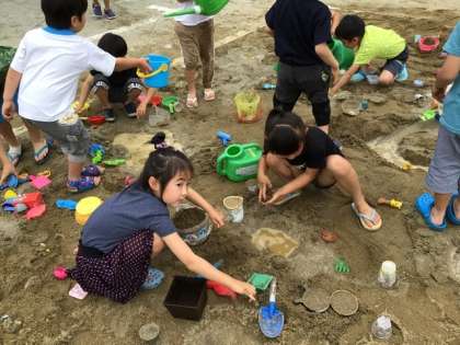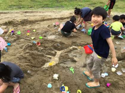 『すなやつちとなかよし』の学習では、すなやつちに思いっきり触れ合いました。感触を楽しみながら友達と協力して作品を作り上げていました。どろんこになりながら、楽しく活動できました。