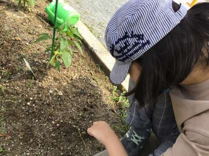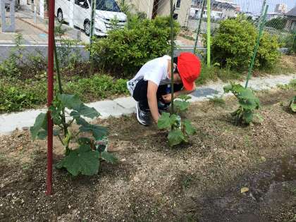 学校の畑に植えた野菜が、だんだん大きくなってきました。今日は、雑草をたくさん取りました。雑草の根っこが手強かったです。