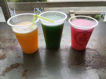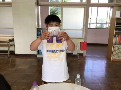 色水を作って、ジュース屋さんを開きました!いろんな色のジュースが完成しました。おいしそうなジュースは捨てずに、カーテンにしていつでも楽しめるように飾りました。