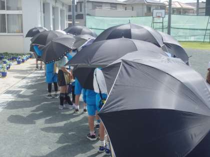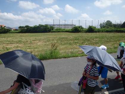 とてもいい天気で、校外学習日和でした。日射しもあり、暑さ対策で日傘を差した子が多かったです。自然豊かな地域を探索しましたが、建物もありました。写真では、浄水中学校が見えています。