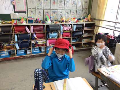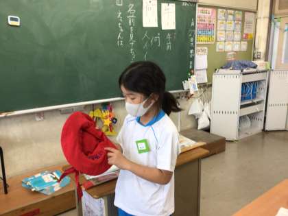 えっちゃんは、ぼうしをぎゅっとかぶります。