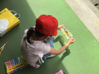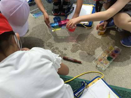 「模様も映ったよ。」「虹色になってきれい。」「水を入れると揺れて見えてきれい。」と、色の見え方を楽しみました。
