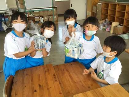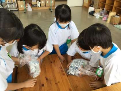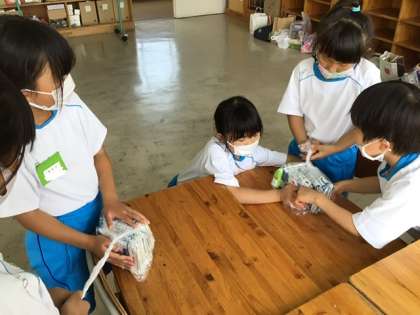 今日は、牛乳パックの綺麗な片付け方を2年生から教わりました。牛乳パックをぎゅ〜っとつぶす人と袋をしばる人と役割分担するとよいようです。空気をしっかり抜いてコンパクトにまとめることができました。2年生のお姉さんたち、ありがとうございました。