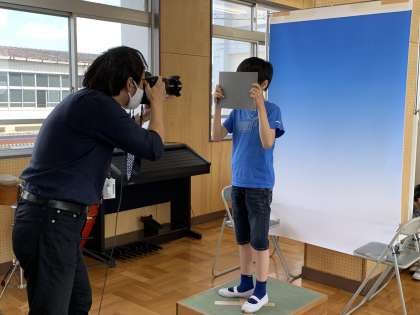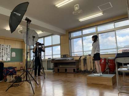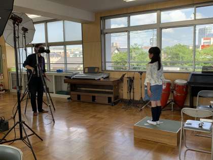 音楽室に本格的なセットが組まれ、子どもたちは少々緊張気味でしたが、無事に撮り終えることができました。