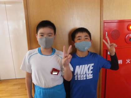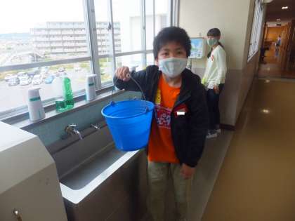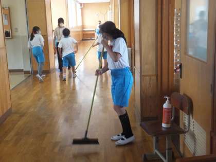 自分たちの教室や廊下の掃除の様子です。廊下に並んで「お願いします」と挨拶をしてから掃除を始めます。「ありがとうございました」の挨拶で掃除が終わります。