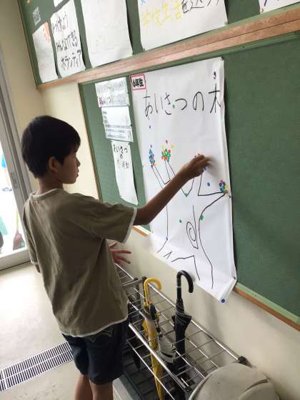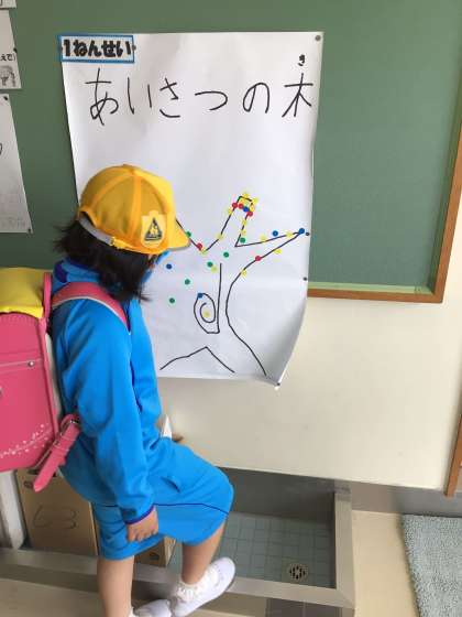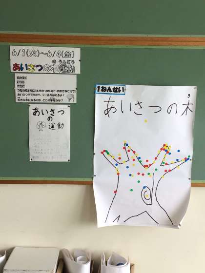 6月1日から「あいさつの木運動」が始まりました。なかよしのみんなも登校時に元気いっぱいあいさつをしています。今朝は1年生と6年生がシールをもらって、学年の木に貼りました。この木がどんどん大きくなるように、明るいあいさつを続けましょう。