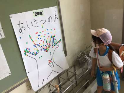 6月1日から4日にかけてあいさつの木運動がはじまりました。明るく、いつも先に、伝わるように気をつけて元気に挨拶をしています。元気に挨拶をしてもらったシールで大きな木を完成させようと頑張っています。