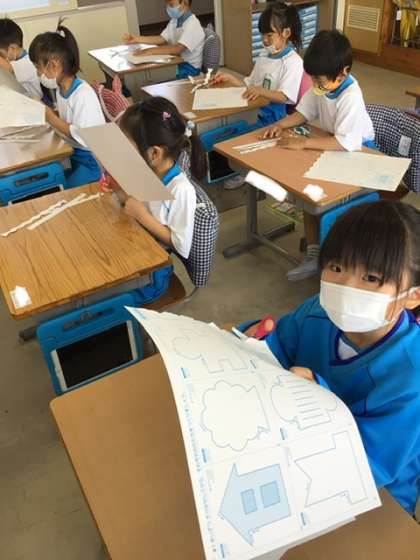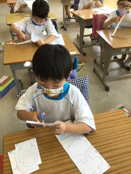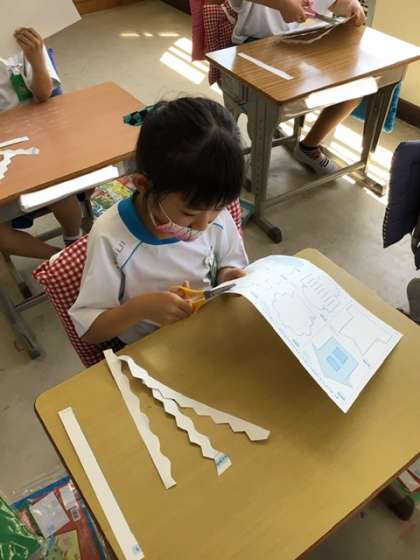 ジグザグやなみなみの線が難しくて、ゆっくり慎重にはさみを進めました。そのあと、家や人、魚や船などの形も切り取りました。次の図工の学習では、カラーペーパーを使って、自分の好きな形を切り取ります。切り取ったものを立たせたら、どんな作品が出来上がるのか楽しみです。
