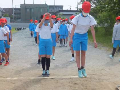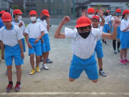 1組は立ち幅跳びを行いました。2回跳び、よい方の記録を使用します。写真3枚共、ちょうど跳んでいる場面です。