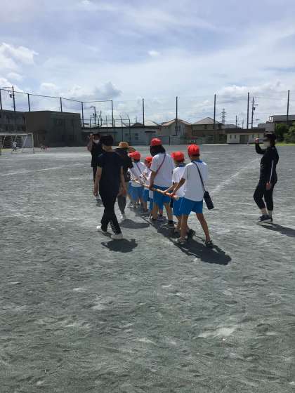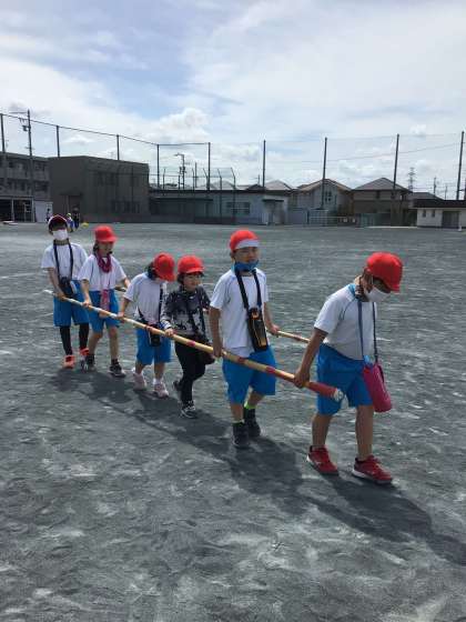 体育で場所移動をする時に、順番を守り安全に移動できるように、汽車になって進みます。1年生が転ばないように、ゆっくりと移動する優しい上級生です。
