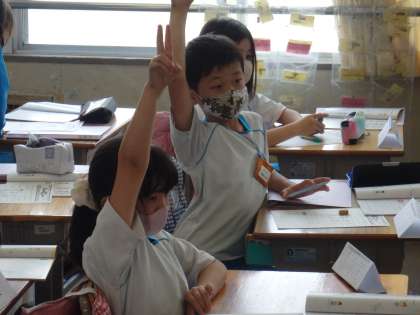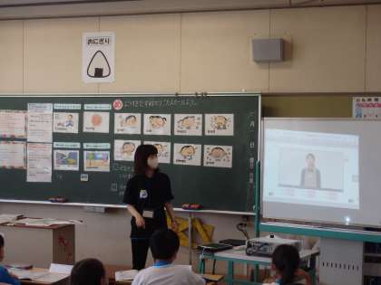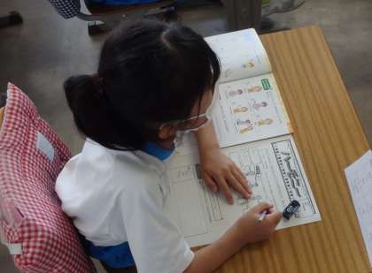 外国語活動の様子です。英語でのコミュニケーションの取り方を、映像を見ながら学んでいるところです。ジェスチャーとともに話される英語を聞き取って、どんなことを言っているかプリントに書きました。
