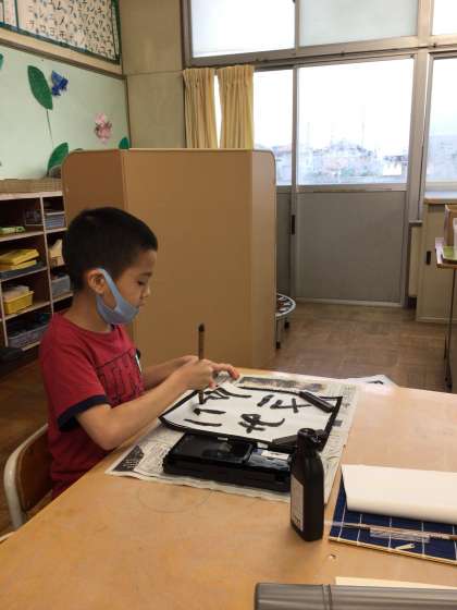 今日は毛筆の学習をしました。筆の先をきれいにそろえてから「トン」と言う合図で半紙に置くことができました。とても集中して書きました。