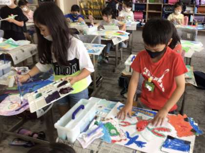 今回は絵の具を使っての仕上げでした。絵の具で全体をぬる子、色を分けてぬる子、筆をとんとんとしてぬる子。いろいろなぬり方を楽しみながら自分だけのふしぎなたまごをつくりあげました。